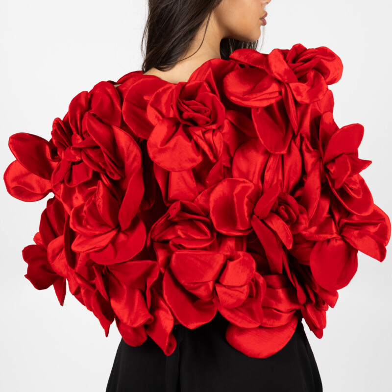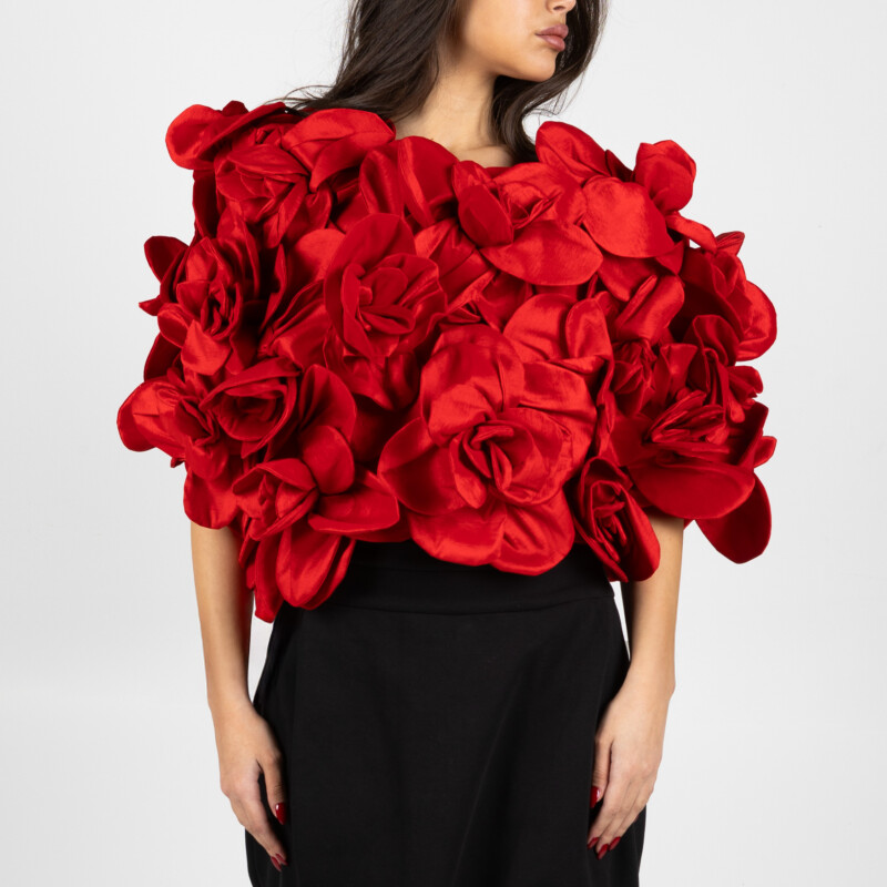 Elegant taffeta blouse with handcrafted roses, designed with love and attention to detail. A perfect blend of sophistication and artistry. Available in black, beige, and white, in standard sizes or made to measure.
