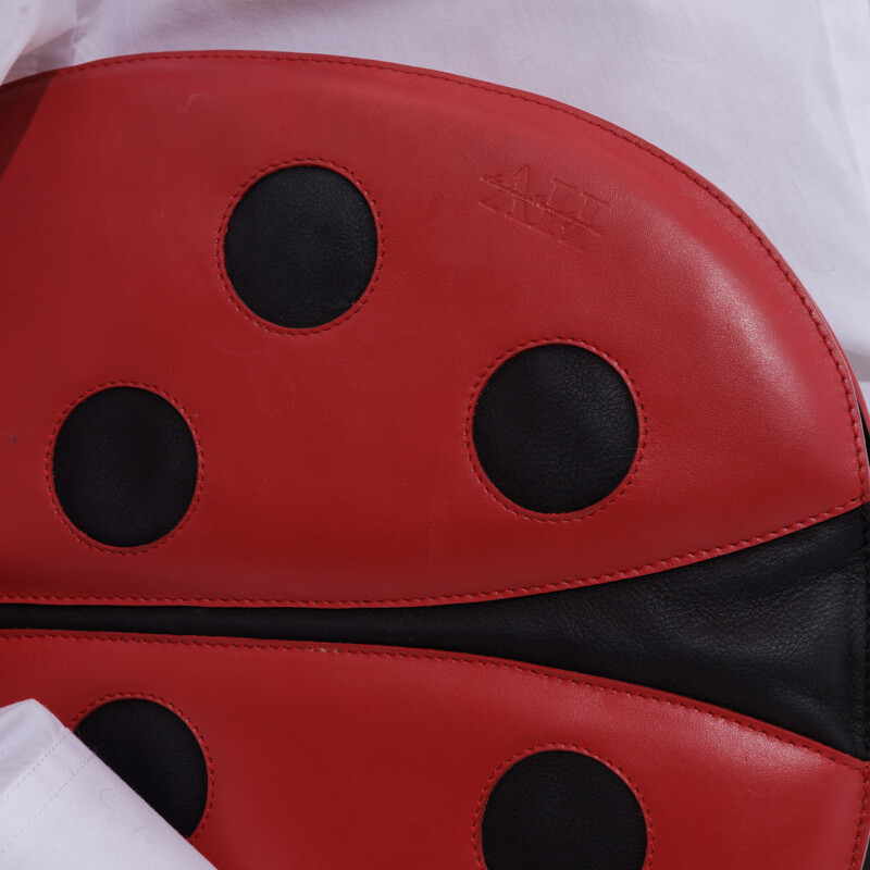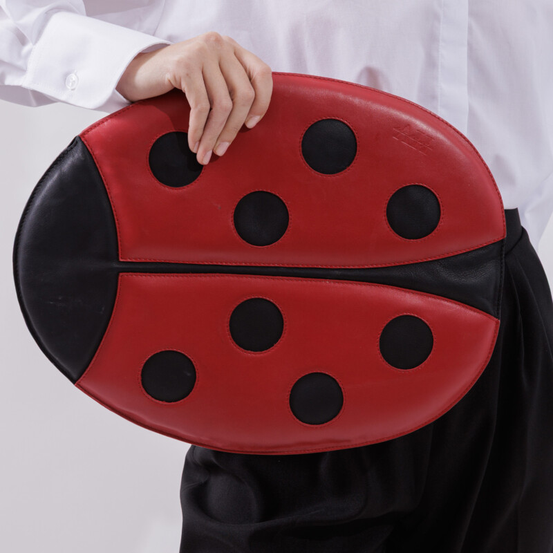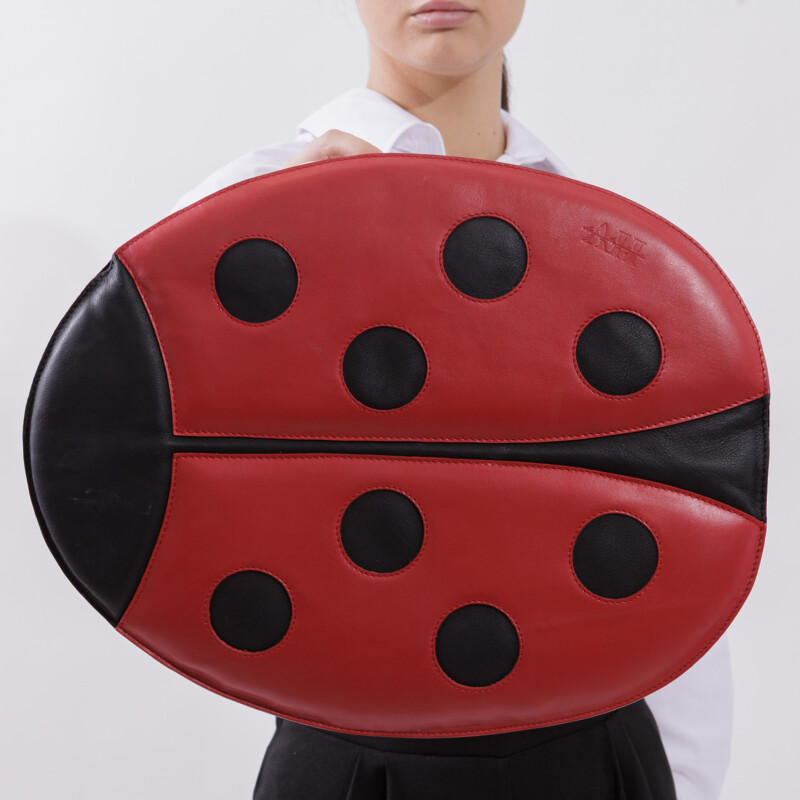 This leather bag is shaped like a ladybug and features a magnetic closure. The interior is fully lined, making it both playful and functional.