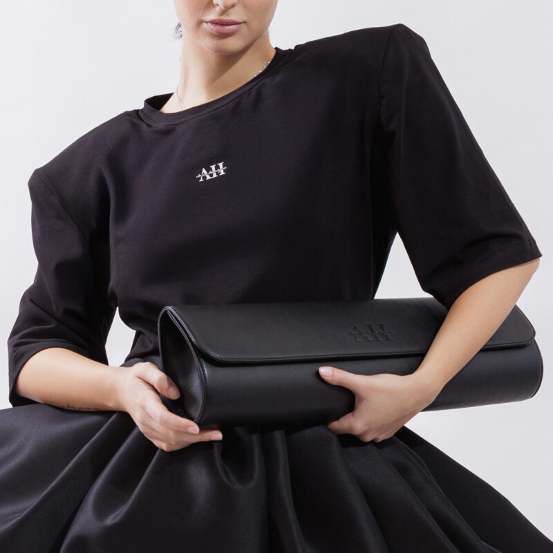 This black leather bag features a long, narrow silhouette with a flap closure secured by a magnet. The bag has an embossed logo on the front and a lined interior, combining sleek design with practical functionality.