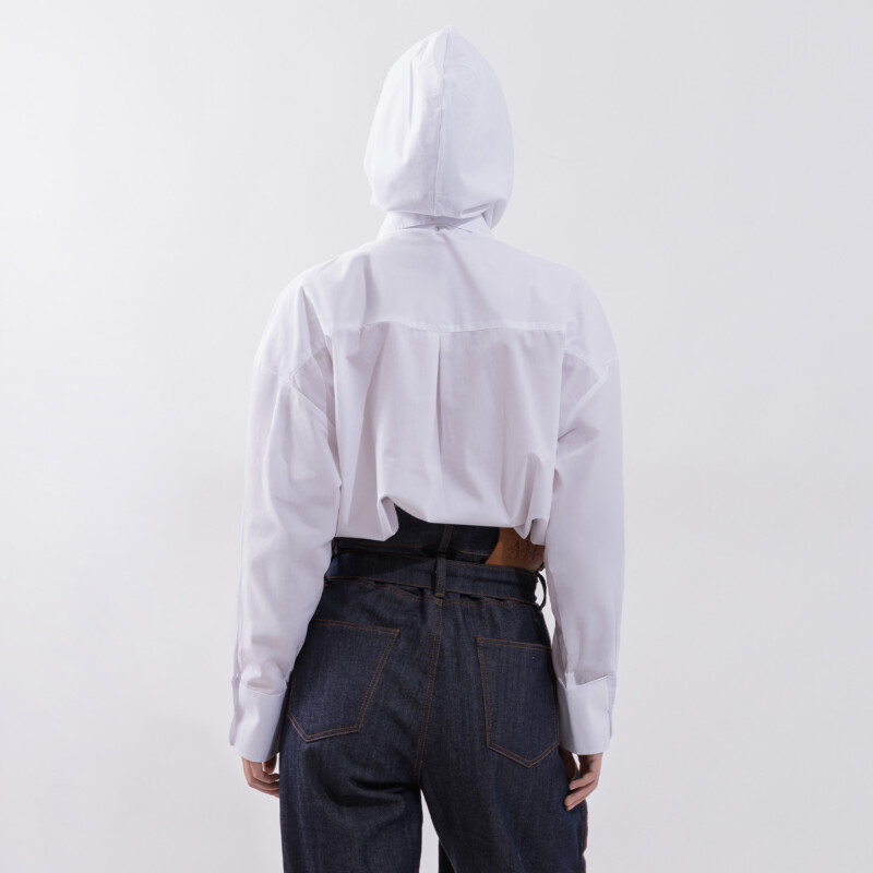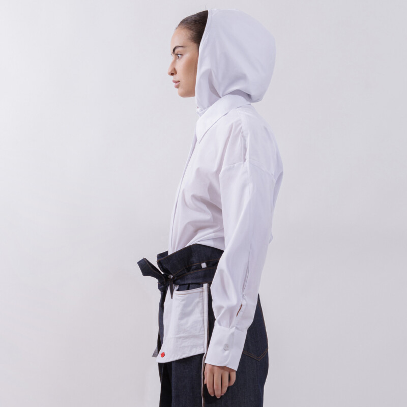 The shirt comes with a detachable scarf that fastens with buttons on the inside of the collar, allowing it to be worn attached or removed depending on the desired style. Comfortable, versatile, and easy to maintain, it offers a modern take on a classic piece.