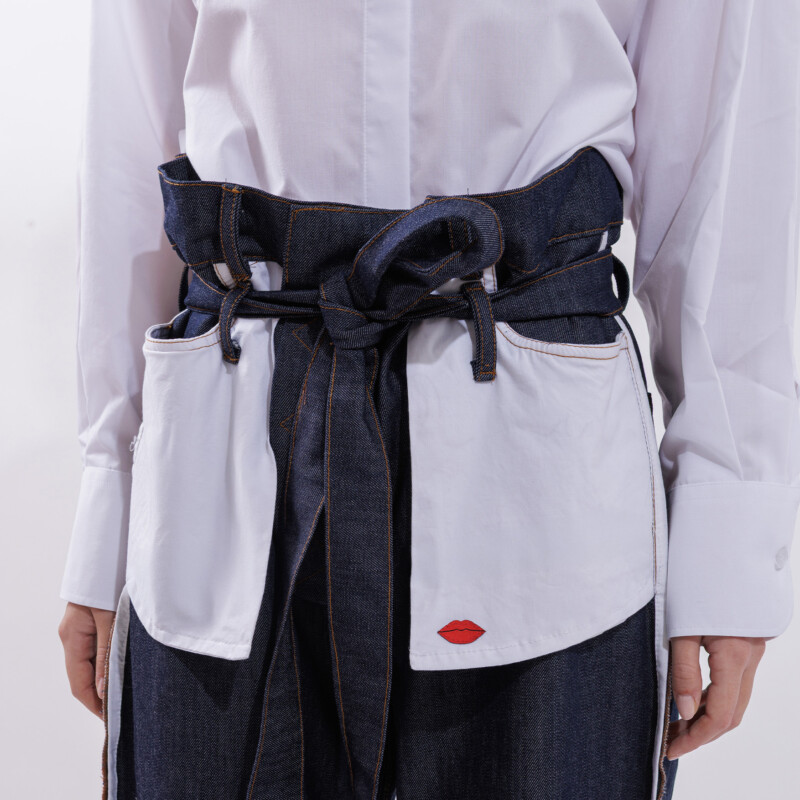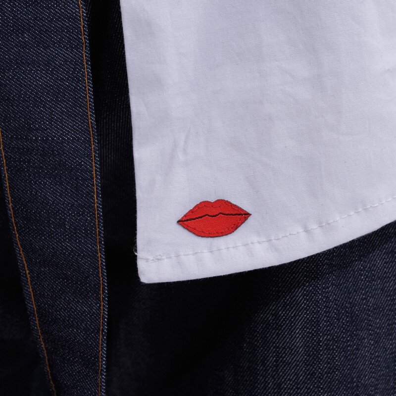 This white cotton shirt is made from a non-iron fabric that stays smooth and neat throughout the day. Designed in an oversized fit, it features a hidden button placket for a clean, minimal look and a small metal detail shaped like lips for a subtle accent.