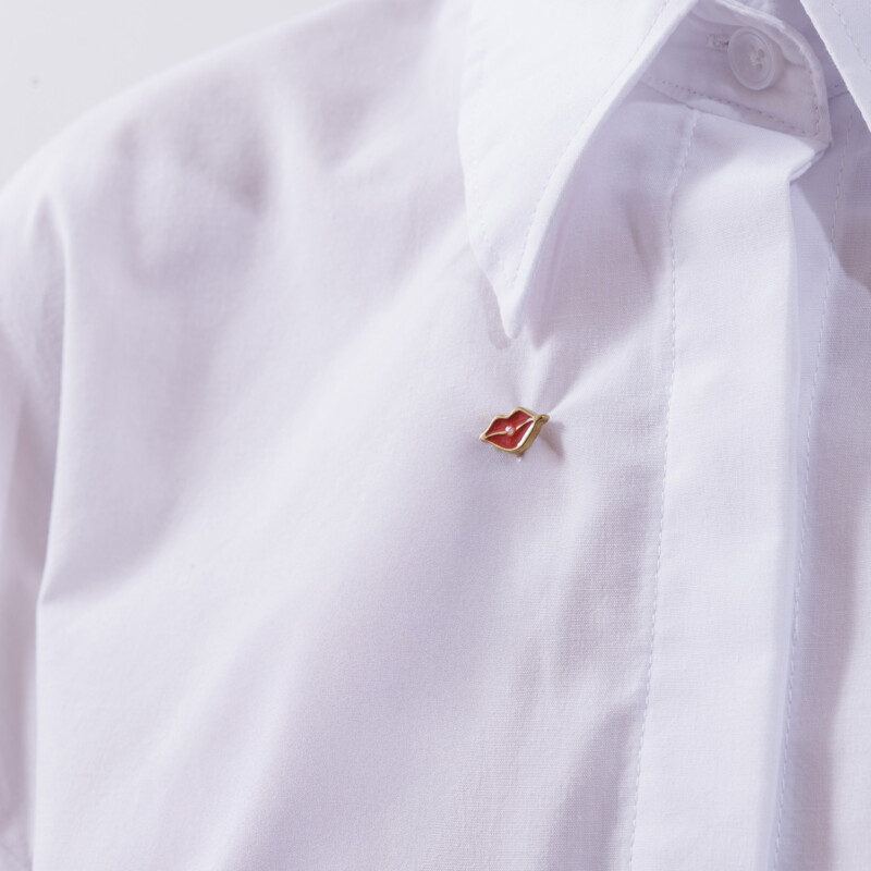 • Oversized white shirt with lip brooch